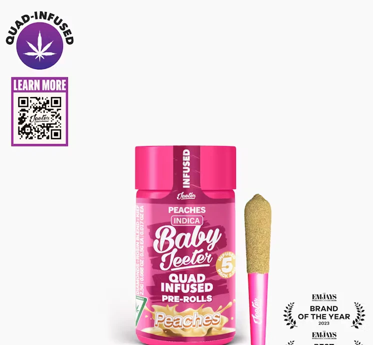 Peaches | Baby Jeeter | Indica 5 x 0.5G Joints 2.5G Total Quad-Infused | Premium Flower Infused with Liquid Diamonds, Rosin Blend & Kief