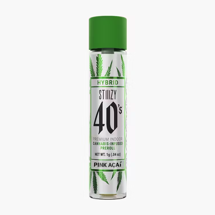 Elevate your pre-roll game. Stiiizy 40s pre-rolls are setting the standard with high potency, cannabis infused joints coated evenly with kief. Using our proprietary live resin infusion methods, we’ve designed every pre-roll to offer 40%+ THC potency with a unique flavor profile. With a smooth inhale and tasteful exhale, each and every Stiiizy 40 is packed with premium grown flower, specifically made to ensure a potent and long-lasting high. Spark up the 40s. PINK ACAI TASTE: Berry, Earthy, Floral FEELING: Relaxed, Euphoric, Happy DESCRIPTION: With its beautiful blend of purple and blue hues, our Pink Acai has a similar flavor profile to that of a fruit smoothie. Enjoy Pink Acai among friends and in social gatherings for an amplified uplifting experience.